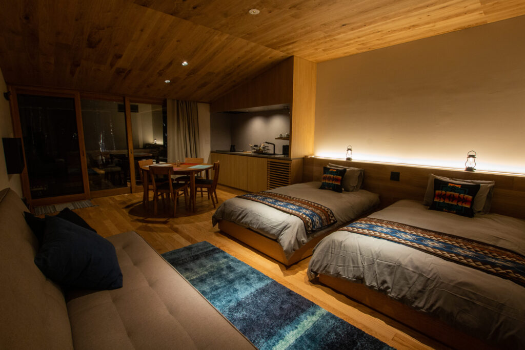 デラックスキャビンは、各部屋ごとにトイレやバスルーム、キッチンを備え、お部屋の前のプライベートデッキには BBQ グリルも完備しています。もちろん暖房も付いているので室内ではあたたかく過ごすことができます。